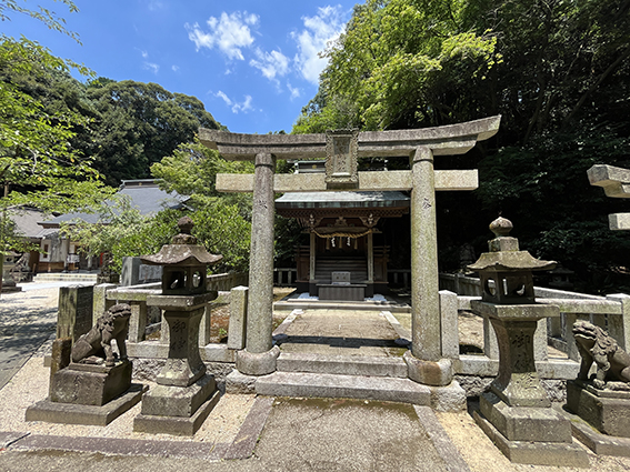 山上から眺めると神社は北に岩栗山、南は伊万里川に抱かれ、 まさに「背山抱水(はいざんほうすい)」の風水の地形である。修験の修業場でもあったのだろう。英彦山との関係がうかがわれた。