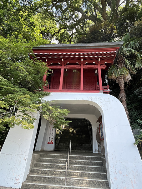 竜宮城の入場門のような赤い伊萬里神社の楼門をくぐって急な登り階段が目の前に迫った。縁結びの大楠が頭上を覆い、緑陰が涼気を差し掛けている。英彦山の石碑が崖下にひんやりと立っていた。九州の修験の山の総本山の碑である。なにか強い霊気を感じた。