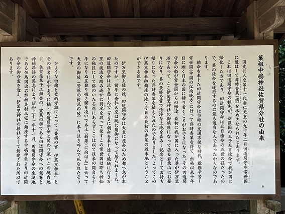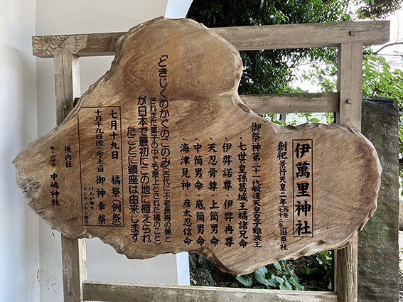 「田道間守命が香橘の木を岩栗山に植えた七百年後に、光仁天皇、西暦770年頃に歌人である橘嶋田麻呂が香橘神社(こうきつじんじゃ)を創建しました。その後、平安期に安部宗任(あべのむねとう)が豊後から松浦郡司として下向したとき英彦山宮を合祀して「岩栗山香橘神社」となり、修験の山ともなったということです。明治の神仏分離期を経て昭和37年に伊萬里神社となりました。お菓子の神社である中嶋神社も合祀してあります」