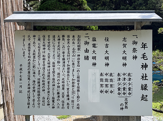 御祭神 志賀大明神(底津少童命、中津少童命、表津少童命)、住吉大明神(底筒男命、中筒男命、